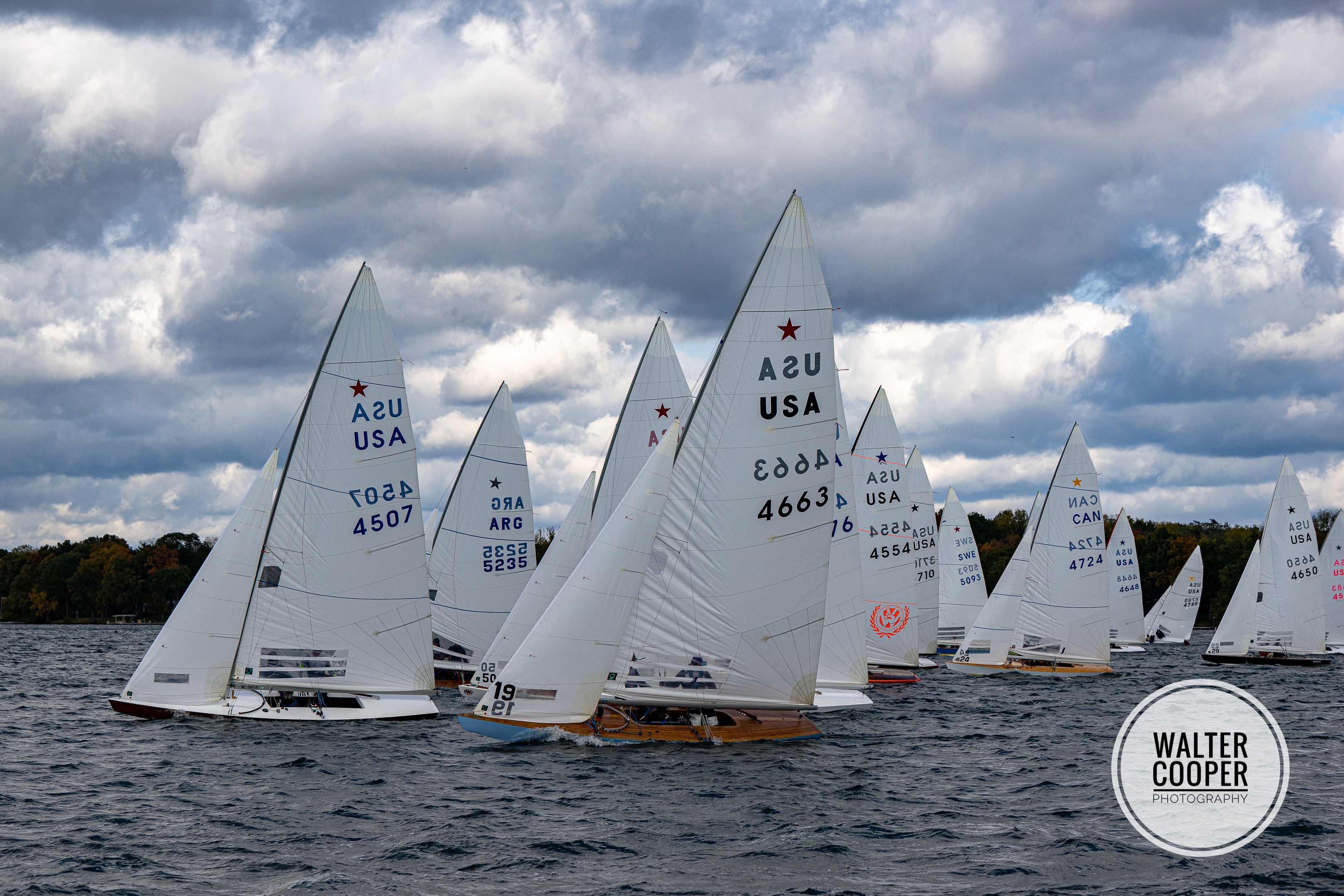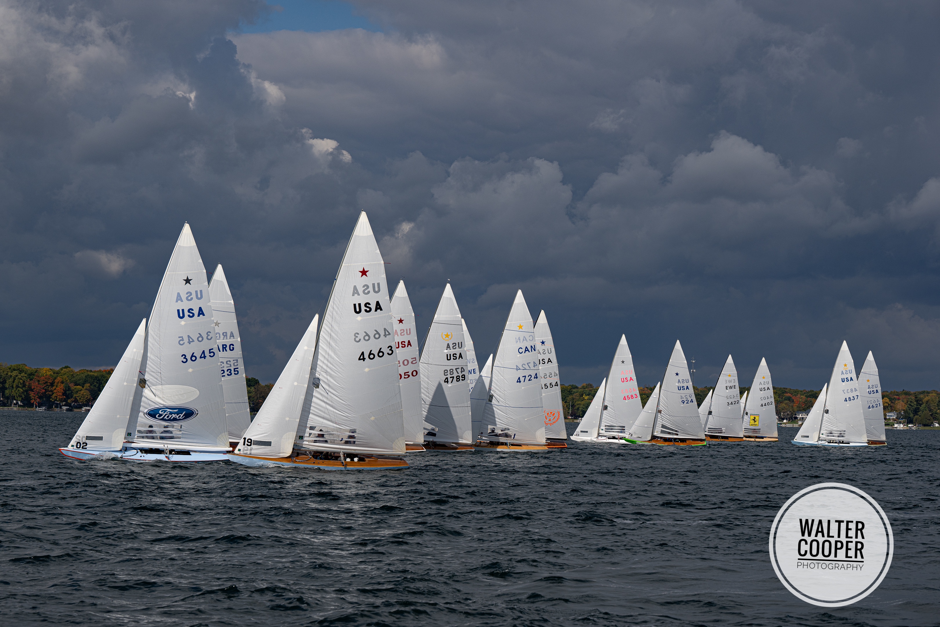 The 6th annual Star Vintage Gold Cup was held from October 12-16, 2022 at Gull Lake Yacht Club in Richland, MI for a fleet of 24 wooden Star boats, none originally built after 1975, lovingly acquired, restored, and maintained by the local team of Don Parfet, Jon VanderMolen, and Mike Ward. Some of the boats have found individual owners, and the team members pour their hearts and souls into those as well as their own, as they all stay in Richland year-round. This year’s fleet included seven Star World Champions and two Olympians.