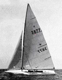 and Burnham. That night, over a gin and tonic, I asked our old camping partner Chick Rollins, "What the hell do they do to run like that?" "Let Your mast go forward," he said- and he showed us how. Third Race We got clear away, started down the shore again. This was the way it almost had to be: a long port tack down the shore, a long starboard tack to the mark. Dr. Mario Quina, the Portuguese, rounded first with a handsome lead. We needed a bit more to lay the mark; it was getting cramped, and there was a strong current running. Ficker was on starboard and we tacked into a close safe-leeward on him, just what he had done to us the day before. The result for Bill was disaster. He had to tack and cross behind several others and overstood the mark by considerable. Dick Stearns rounded the mark second, followed by Straulino. We were fourth with Burnham only five lengths behind. Today though, the Turmoil was playing a new tune on the run. We ran through Stearns and Straulino, up to second place. On any other day, Burnham would have made 20 to 40 yards on the run. (The course was windward leeward.) Today he barely gained the 5 lengths we were ahead. When we neared the mark, Malin was running close, so I sailed off by the lee, hoping he would go outside for the turn. He bit on it at first, then realized there wasn't time to get by us, before the mark, and veered under for an overlap. "Now Gary," he said, "you wouldn't sail below that mark, would you?" Well, as long as he put his bow in there, I figured I wouldn't. We both turned the mark from a broad angle, Malin going ahead and on to our wind. Up till this time, we'd made all our points by sailing high. But now we had to foot. We cracked out and let her swim- and she swam! We sailed right through Malin, tightened up into a safe leeward and kissed him off. I don't think Malin had experienced anything like it this season-and neither had we. But there was more to come. Mario Quina had worked into a lead that looked to be about 100 yards ahead of us and 50 yards to windward. The swimming was great. We closed the 100 yards between, losing only a few yards to leeward. Quina tacked. We continued down the shore, sailing for speed. Soon we were in a dangerous position. The entire fleet was to sea of us. Although we were on the favored side, a wind-shift would have ended us. We tacked, and it was soon apparent that the Turmoil was ascending. Quina had the others by a light-year and it looked like we had him. He came over, and we forced him to tack, but he missed the safe-leeward. We went together for a while like we were tied, he to leeward and slightly ahead. He was right in my pretty picture window. He was, that is, until I reached for the traveler and knocked the whole business loose. We sagged right into his backwind and had to tack. The next time he came across, he had us by a length. He carried on about 20 yards and tacked to lay the mark. We laid it from where we were- we had to! We rounded ahead, almost overlapped. Billy and I were not unhappy at this time. I called, "Buenos Dias, Señor- it's a good day for red boats!" He agreed. We exchanged the lead with him several times on this run- till we jibed away for position on Straulino and Burnham. That jibe might have cost us the race, and the Vanderveer trophy. Quina won by 15 seconds, we were second, Straulino third and Burnham fourth. North, by sheer determination, had sailed from dead last, fixed his backstay before the run and finished fifth! North Star and Turmoil were now tied for first place with 85 points- but North had us on horserace. Malin was 2 points behind us, 6 ahead of Quina. We were disappointed to lose the Vanderveer trophy, but not too disappointed, considering that we had almost not come to Newport and were now contenders for a Gold Star. I asked Chick how we looked on the run today, and he replied, "Not right yet, kid." The next day was rest day, and we re-rigged completely for West Coast running. Bob Davis, whom we were staying with, figured out a cantilever arrangement for our backstays. Bob took us down to the South Coast Company, and with the help of Leo Benzini, had the fittings made. About noon, Bob, who is President of his own company, excused himself. "You're pretty well set now," he said, "and I have to get to work. This morning they started up a hundred thousand dollar machine I designed, and I should be there to see if it works." Bob's thoughtfulness was typical of our treatment at Newport. I know all of the sailors had the same delightful experience. As I said, we were staying with the Davises. Every morning Jane would pack a lunch for us with enough food to stuff a tribe of boy scouts: steak sandwiches, fresh fruit, orange juice, milk and candy bars. I gained five pounds that week. We didn't lose weight working on the boat either. "Caddies" were assigned to each Star, and they did the work, sponging the bottom in the morning and washing off the salt and putting the sails away after the race. Before the series began, Chick Rollins offered to furnish us with a "mother ship". It was a long hour's tow to the starting line. Chick could have shown up with an outboard dinghy, and we'd have been thankful- but he does things big: a plush fifty-five foot Alden yawl, no less! After the race, a pair of Chick's crew would step aboard and take charge of Turmoil. We'd board the waiting Kirawan for our daily gin-and-tonic. Believe it, we were livin'. The preparations for this regatta must have taken a year, there were so many things done for us. All came off quietly and perfectly. The trophies were beautiful old English silver. There were mugs, chafing dishes, coffee servers- and one I received an antique egg broiler. Every one of the trophies was a treasure. One superb touch: at the winners' dinner each skipper and crew was presented with a leather bound scrapbook; inside was a complete set of news clippings, along with a program containing the final results. Everyone who was th
