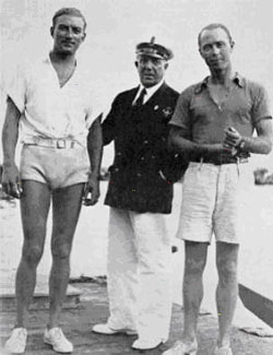 (Starlights, April, 1969) He moved from Germany to Brazil during the war, has raced successfully there ever since in a succession of Pimms, and has competed eight more times in World's Championships. In 1960 his cumulative point score took the World's to Rio de Janeiro for South America's only Gold Star series. He won the VII District Championship in 1964 and is currently Brazilian National Champion. Racing has been von Hütschler's life. During the early years he kept detailed records of all his races. These had to be left behind in Germany and were lost during the war, but Walter claims that it didn't really matter: "I remembered so well every race I ever sailed that I didn't need records." The intensity with which he concentrated on the game in those early years is pointed up by his attention to detail on the Pimm. "If I thought a cleat might be handier in a slightly different position I would move it, even if only a couple of inches. If that didn't suit, I moved it back again." His arch rival for many years in European and World's Championships was Agostino Straulino, the great Italian ace who has three Gold Stars to his credit. "I studied Straulino's methods and techniques until I could read his mind. I knew before he did whence was going to tack, and why." Walter von Hütschler has always been one of the Star Class's staunchest supporters. The best interests of the Class are a primary concern to him. He has held the office of Rear Commodore for the past eighteen years. His business travels allow him to visit the Star office in New York at least once a year, where we welcome his cheerful smile and his never flagging zest for living. He likes to time his European visits to coincide with Kiel Week, and any year may find this expert, no longer young but as keen as ever, racing, often in a brand new Pimm, on the windy Kieler Fjord which is still his favorite sailing ground. ---------------------------------------- Albert