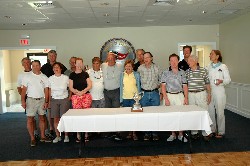 | The 2008 Dr. David Oursler Star Spring Championship Sailed May 3-4 at the Miles River Yacht Club, St. Michaels, Maryland The weather Saturday morning was beautiful for star sailing. It was blowing 8-14 knots from the SSW and the temperature was climbing into the 70’s. The first race saw a battle between Dan North and Bob Bradford as they pulled away from the other 6 boats in the shifty conditions. Bob was able to edge Dan out at the finish, while Don Elliott was third followed by Chuck Wiley, Karen Alt, Carroll McCallum, Will Murdoch and Sam Hopkins. The windward leeward courses with the finish at the end of the third beat proved challenging as Ernie Becker and the MRYC race committee did an outstanding job. This format was used throughout the regatta. The second race saw a few problems. A couple of boats were over early at the start and unfortunately Dan North didn’t hear the bad news till he had rounded the windward mark in good position. Sam Hopkins and Carol Boykin found their jib coming apart at the head and had to call it a day. At the start, a right shift momentarily favored those starting toward the committee boat. Don Elliott and Doug Campbell won followed by Carroll McCallum, Chuck Wiley, Will Murdock, Bob Bradford, and Karen Alt. Again in the third race, the shifty conditions scrambled the finishes. The wind varied between 180 and 205 degrees with large gains possible on the runs as well. This time Carroll McCallum and Jim got the victory followed by Bob Bradford, Karen Alt, Dan North, Will Murdock, Don Elliott and Chuck Wiley. Too much of a good thing? Maybe. Maybe not! The race committee decided to improve the chances of a complete 5 race regatta by having another race since it was only 3pm and conditions were ideal. Carroll McCallum continued her late day dominance and bested the fleet followed by Don Elliott, Bob Bradford, Will Murdock, Dan North, Karen Alt and Chuck Wiley. As we all dragged ourselves back to the club we wondered at Chuck Wiley’s stamina. How could an 80 + gentleman stay out there with us tired young whippersnappers? Sunday morning saw a frontal passage followed by patchy fog, which pushed the start back to 11 and the wind to 10-15 knots from the North. This final one race shootout would determine the regatta because the top three boats; McCallum, Bradford and Elliott, were only a point apart. Again close racing, but this time with a steadier breeze. Bradford got an early lead starting at the committee end holding off challenges from Alt and Elliott. As the air lightened, Murdock became a contender on the last run, then, the final beat. Bradford held on to win by less than a boat length and was able to watch the next 3 finishers cross the line overlapped. So when the regatta results were tabulated (following bloodies at the bar) it was Bob Bradford and Rowan Perkins taking first. Don Elliott and Doug Campbell, second and novice. And Carroll McCallum and Jim Pickering, third (and honored out of town guests). They were followed in close order by Will Mudock and Carl Lankhammerer; Dan North and Jeep Jallede; Karen Alt and Bill Cockayne/Tim Godlee; Chuck Wiley and Tim Paris; and Sam Hopkins and Carol Boykin. Past Commodore Suellen Gargalli presented the trophies in the newly renovated Commodore’s room. All the participants thanked MRYC and Ernie Becker’s Race Committee for a marvelous regatta. The only question left unanswered was why weren’t more stars out enjoying these great conditions? Maybe next year the secret will get out. |