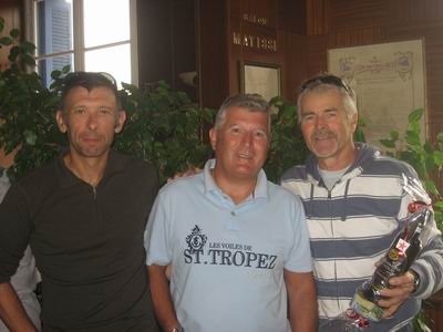 | Three very closely fought races in a dying breeze 6 to 4 knots. Three teams tied on points for the first place, but Michael Willis/Patrice Loche were the winners, followed by Olivier Godefroy/Thomas Giorgi and Jean-Gabriel Charton/ Olivier Terrol. On the picture, the sponsor of the day Dominique Giorgi, with the winners Patrice Loche and Michael Willis. |