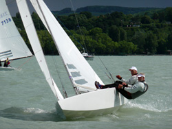 | Sailed at Spartacus Sailing Club, Balatonfoldvar, Hungary. Tight and exciting races in moderate conditions with busy mark roundings even with only 11 boats. Nice but expensive regatta, two masts went down in a collision on the first day. This year’s newcomers Arpad Litkey and Gyula Monus won their first event in the class. |