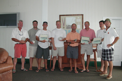 | The wind gods seemed to toy with us in the morning. A very light breeze out of the East (not a good direction from pretty much anywhere on our beautiful bay) started building to 5-6 kts for the first race on Saturday. It continued to build to around 9-10 kts out of the south/southeast for the third race of the day. John MacCausland continually gave us a sailing lesson today, hitting all the shifts and just plain doing everything right. The rest of us worked very hard to keep each other in check. The wind gods took Sunday off and after a tow to the racing area and lengthy picnic and swim in the bay the race committee finally called it a day. Gunti Weissenberger and Chris Brown won the Novice Trophy, Tom Price and Will Wagner won the Master Trophy and Aaron Serinis with Joe Balderson won the under 7000 award. Many thanks to the Race committee for a job well done, to Gunti and Claudia Weissenberger for the Friday evening cookout, the Gibson Island Club for a wonderful dinner and old movie, and to Denver for the Sunday afternoon dock party. |