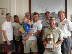 | It all started out looking too calm, cool and collected.....overcast, no breeze and a lot of current due to the dams being opened up on the Susquehanna. The committee towed us across the shipping channel to the flats where some of us promptly anchored and waited for the breeze to fill in. Close to 2 hours later a little puff turned into a 345 course. The committee was able to pull of two good races on Saturday. Saturday evening the GIYS put on their traditional (72 years) dinner in the Rotunda of their clubhouse. The Clubhouse is on the bay side of the Island and it all glass front provides beautiful views of the Chesapeake Bay. The atmosphere provided the the "icing on the cake" for the superb dinner. Sunday's weather forecast was better and we weren't yet privvy to just how much better. The breeze filled in at around 200 degrees and built to about 15 kts. at 195 by the third race of the day. In the end, John MacCausland and Shane Zwingelberg won a tie breaker with Pete McChesney and Mike Jones to win the Miller Series and earn another Blue Star. Many thanks to Murray Leigh for putting the event together, Claude Engle, Ron Ward, Jack Lynch and the rest of the great Race Committee people who lent their time and their boats to make this a successful District Championship and Miller Series. |