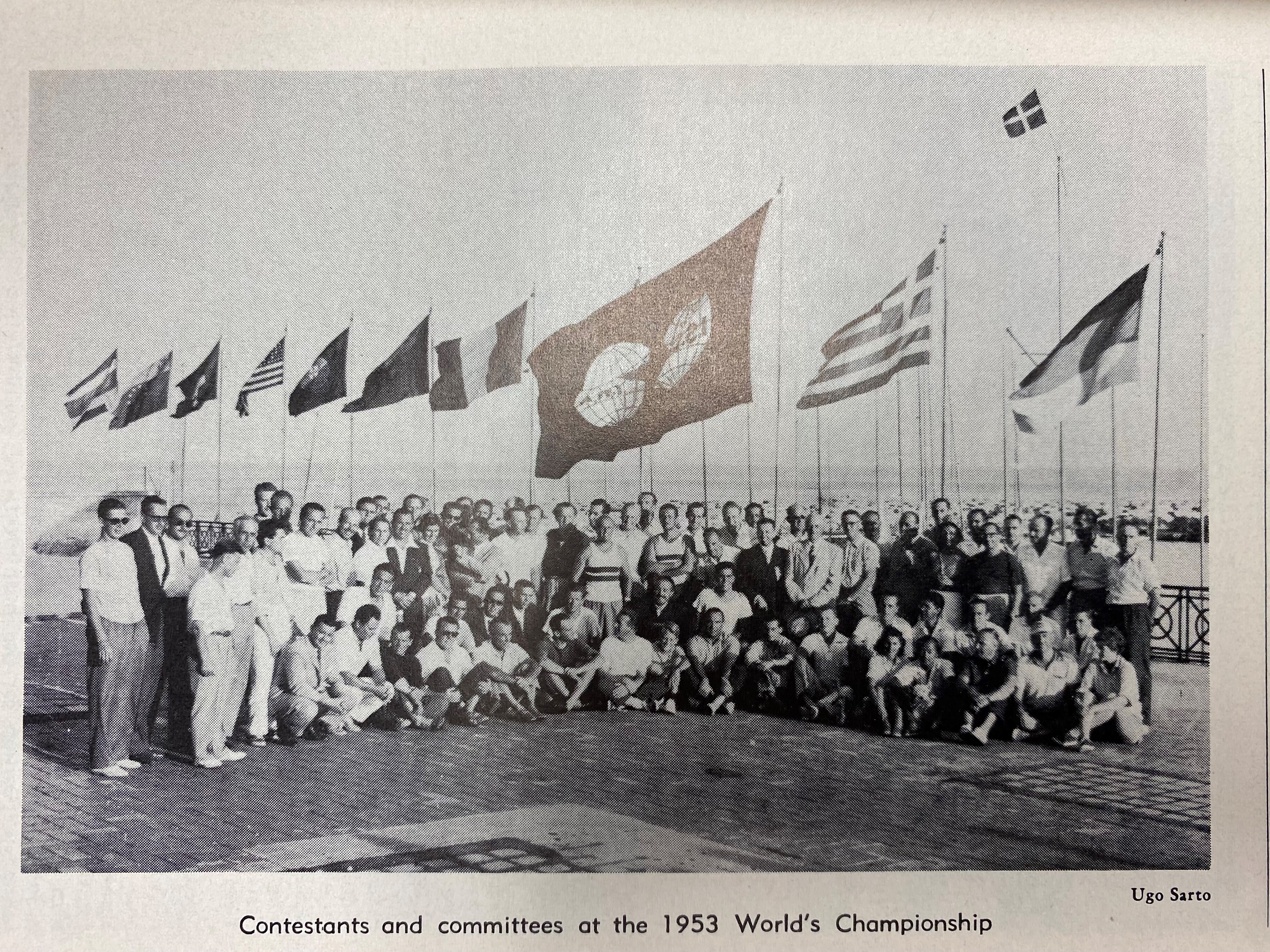The 1953 series was sailed off Napoli beneath ominous Vesuvius that towered in the background. Straulino won again, but only by four points, over - guess who - the ever persistent Duarte Bello. Nordio, of Trieste, was a poor third. Since under our rotating rule the same fleet cannot hold the event for two consecutive years, the location had to be decided on aggregate points and it went back once more to Cascais. Now that really is remarkable. Three times Duarte Bello took the World's Championship back to Portugal by aggregate points. He had the help of Capucho in '46 and '49 and of Tito in '50, but Bello was the anchor man each time and sewed it up. The third time he did it single handed. Here you have a record for both a fleet and a skipper, which I doubt will ever be matched again.