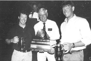 The 1994 Star Class world Champions Ross Macdonald, left, and Eric Jespersen, right, being presented with Mid-Week Awards by San Diego Yacht Club Commodore Tom Fetter. Photo by Barbara Martin