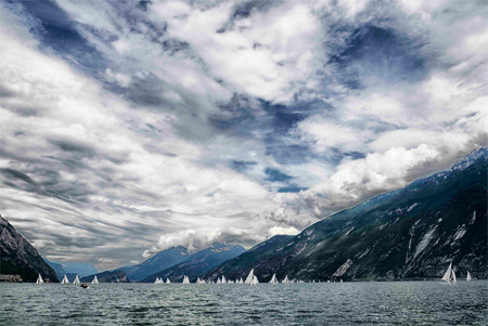 Clouds above The Dolomite Mountains and clear blues skies above Lake Garda provided classic Ora conditions, with 12 knots of warm breeze pumping from the south. The first Saturday in July meant plenty of windsurfers and kite boarders out on the lake and sky divers forming arial acrobatics riding the thermal wind from Mount Baldo. Hundreds of spectators watched the drama unfold from the pristine Lake Garda beaches.