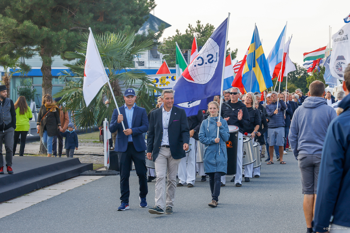 The curtains of the 99th Star World Championship have been officially lifted with the Opening Ceremony, tonight at the legendary 1972 Olympic Village in Kiel, Germany. A parade of the sailors with a flag bearer for each of the 18 nations represented by the 83 teams marked the opening of the Gold Star event. Everyone is eager to race and most of the large fleet hit the water today in 15knots northerly breeze, sunshine and the typical ‘Kiel chop’.