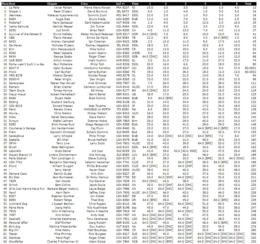 "Overall not a bad day," said Peter O'Leary. "After two days on shore we were very happy to be on the water again. Conditions were good, yet a bit tricky with big waves that made sailing interesting. We were first at the first mark and we took it from there to the finish. In the second race we had an excellent start and then had to overcome a big wind shift. We made it to the top mark in the top group, and although we wanted to win we had to settle for fourth."