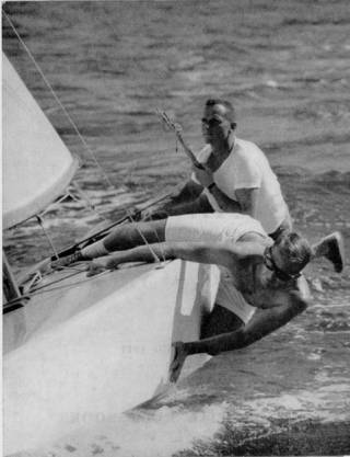 Even greater athleticism was shown by Lowell North and Jim Hill on their way to win the 1957 World’s. In theory, hiking aids were still not allowed, but it appears the Jim is hanging onto the jib sheet which under strict interpretation of the Star Class rules was not allowed.