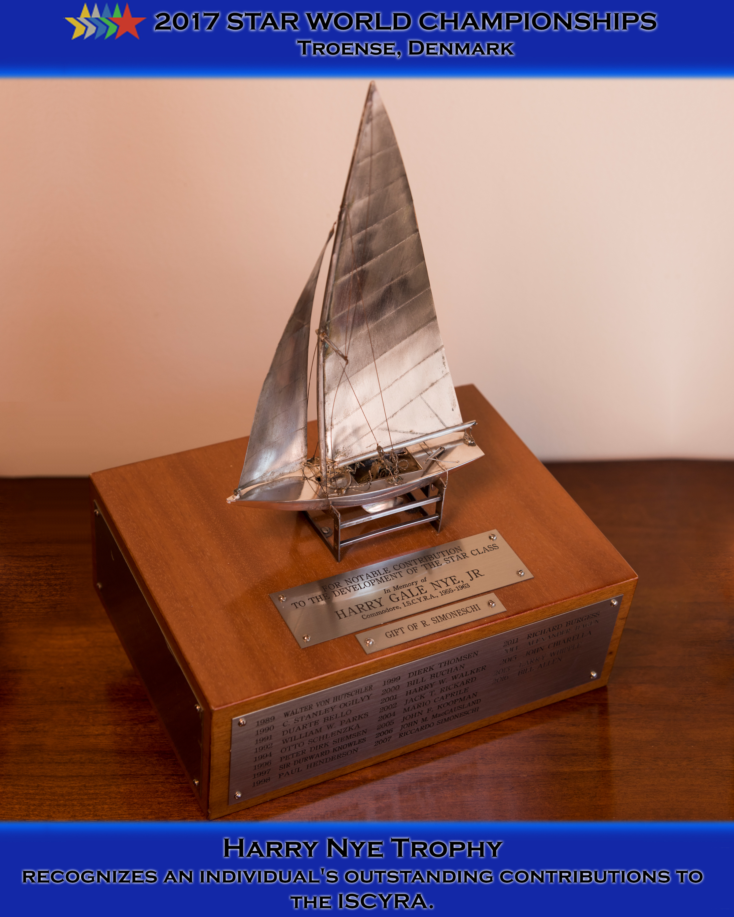 This trophy is named for Harry Gale Nye (1908-1987) who was twice Star World Champion (1942 and 1949), and served as Commodore of the Star Class from 1955 to 1963. He also won the Bacardi Cup and the Cup of Cuba three times each. A graduate of Yale University, Nye was for many years the owner of Murphy & Nye Sailmakers, Chicago, Illinois, USA.